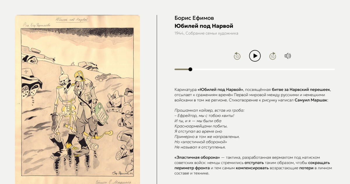 Карикатура «Юбилей под Нарвой», посвящённая битве за Нарвский перешеек, отсылает к сражениям времён Первой мировой между русскими и немецкими войсками в том же регионе. Стихотворение к рисунку написал Самуил Маршак: